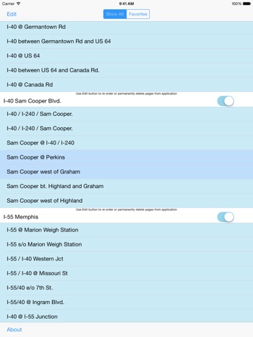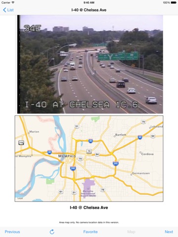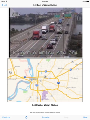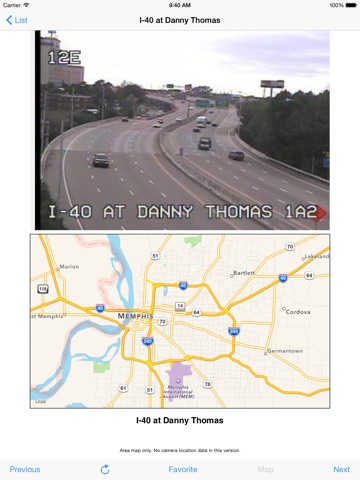 Touch the Favorite button on any camera page to copy the traffic cameras that matter to you to your Favorites list for faster access. Switch quickly from Show All to Favorites mode. In Favorites Mode the Previous and Next buttons follow the Favorites list.