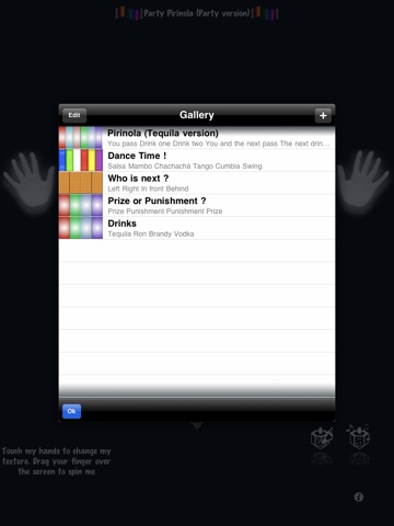 The new version 1.2 contains a gallery of predefined Pirinolas ! Now you can use them to animate your parties and for a wide variety of situations. For example, You can use it to decide What kind of food to eat ?, Who pays the bill of the restaurant ? etc…