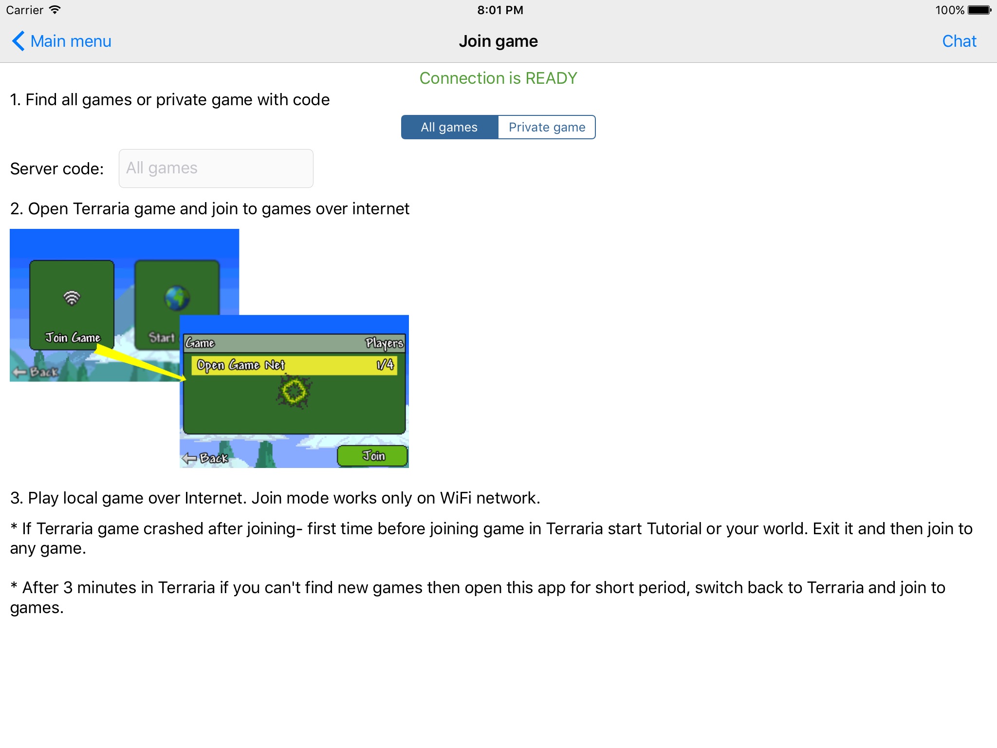 Cant join anything i always lose connection once I go to Terraria I had this app before and it worked fine then when i reinstall it it doesnt work I even uninstalled and reinstalled it again to try to make it work but it doesnt work it says connection ready when im on the app but then i go on to Terraria and find no worlds when i go back to the app it says connecting! This is absolutely horrible.