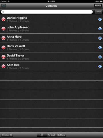 This app helps you quickly delete multiple contacts, contacts in a group and all the duplicates from your address book and allow to take backup and Share Via Mail !