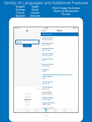 App allows you to translate from Russian (or to Russian) to English, French, German, Spanish, Italian, Dutch, Latvian and Estonian. Flash cards and iCloud sync included.