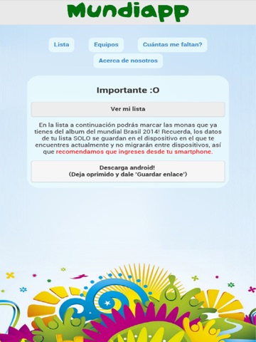 Mundiapp es la aplicación que te ayuda para que llenes tu album del mundial más fácil y rápido! Selecciona las monas que ya tienes, las que te faltan y hasta las que tienes repetidas!