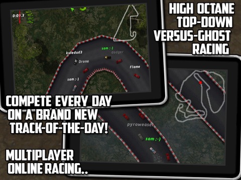 Massively multiplayer online racing game. Race against the ghost recordings of your friends and players from around the world. Design and share your own racetracks. Collect over 100 cars and race them in 11 classes. Compete on a new racetrack every day. Play in 3D or top-down 2D!