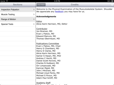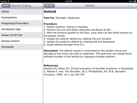 This app, by the American Academy of Orthopaedic Surgeons, presents the techniques for physical examination of the shoulder. The app presents video demonstrations for Inspection & Palpation (5), Muscle Testing (8), Range of Motion (4), and Special Test (12). The Program is ideal for medical students and residents. Each technique demonstration is preceded by a peer reviewed explanation of the procedure including possible diagnoses, procedural steps, positive test characteristics including statistical values for some tests, and other information, including references.