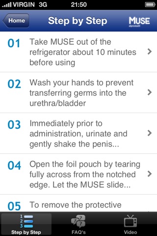This app has been designed to help guide and support patients prescribed MUSE® (alprostadil) in the UK. Within this app you will find several features to help you achieve the best results from MUSE®. The app has a simple, intuitive interface covering a step-by-step guide, a demonstration video and an FAQ section.