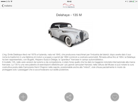 The Museo Nicolis app, available to every visitor, is a tool that enhances a visit to the Nicolis Car, Technology and Mechanics Museum in Villafranca - Verona, one of the most prestigious private museums in Italy and Europe. The facility houses a total of 9 collections, about 200 cars, 105 motorcycles, 120 bicycles, 120 musical instruments, 500 cameras, 100 typewriters, small planes, about 100 Formula 1 steering wheels and valuable travel accessories.