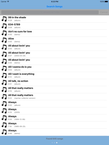 3 - SONGS (More than 600). It is a search engine Bon Jovi songs where you will find all the songs released on official albums, with all the information (title, author, edition, distributor).