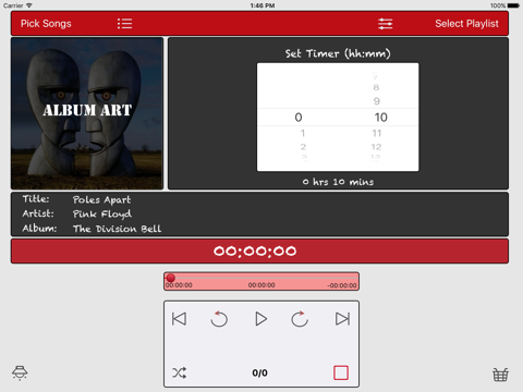If you want your iPod music to play continuously for a set amount of time then this app is for you. You can pick individual songs from your iPod music library or pick an entire iPod playlist. The selected songs will loop for time duration set by you. The selected music playlist can be controlled using gestures when in night light mode.