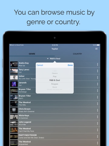 Music Tube is best application for listening music on iOS. All your favorite music in one application. We prepared for you best music playlists. You can browse music by genre or country. Discovering great new music has never been simpler. Enjoy music on YouTube!