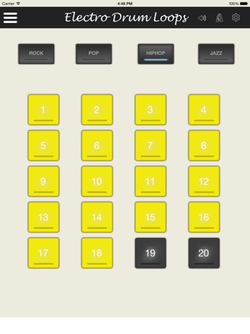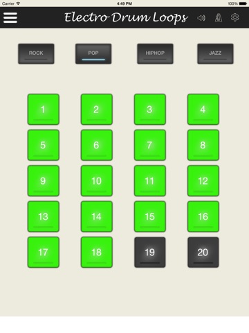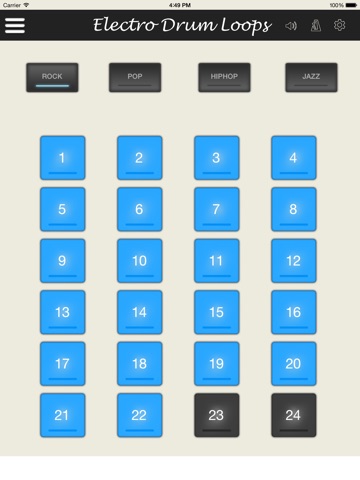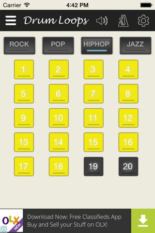 Just open the Musical Drum Loops application and select the category from various drum sound such as JAZZ, ROCK, POP, or HIPHOP. Now tap on the tone from the given list to play it continuously till you want. To stop the rhythm just tap on it again.