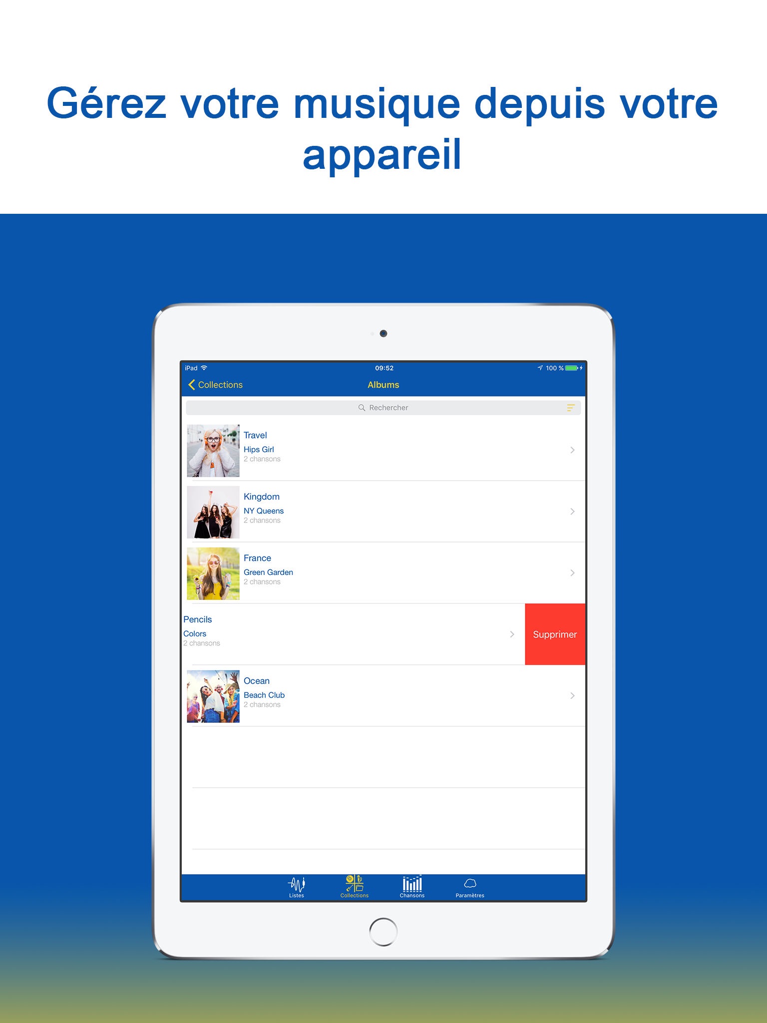√ Order your music by title, added by date or artist.