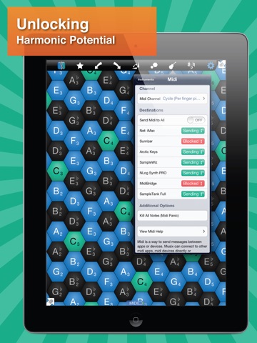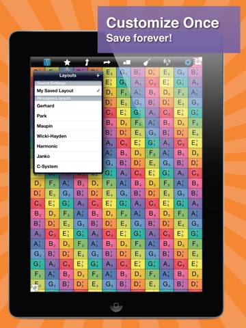 Musix Pro comes with a set of built-in layouts, each with its own pros and cons. The harmonic table layout allows you to play any major chord by touching three hexes with one finger. Wicki-Hayden makes modulating between pentatonic scales a breeze. Try them all and find one that works for you.