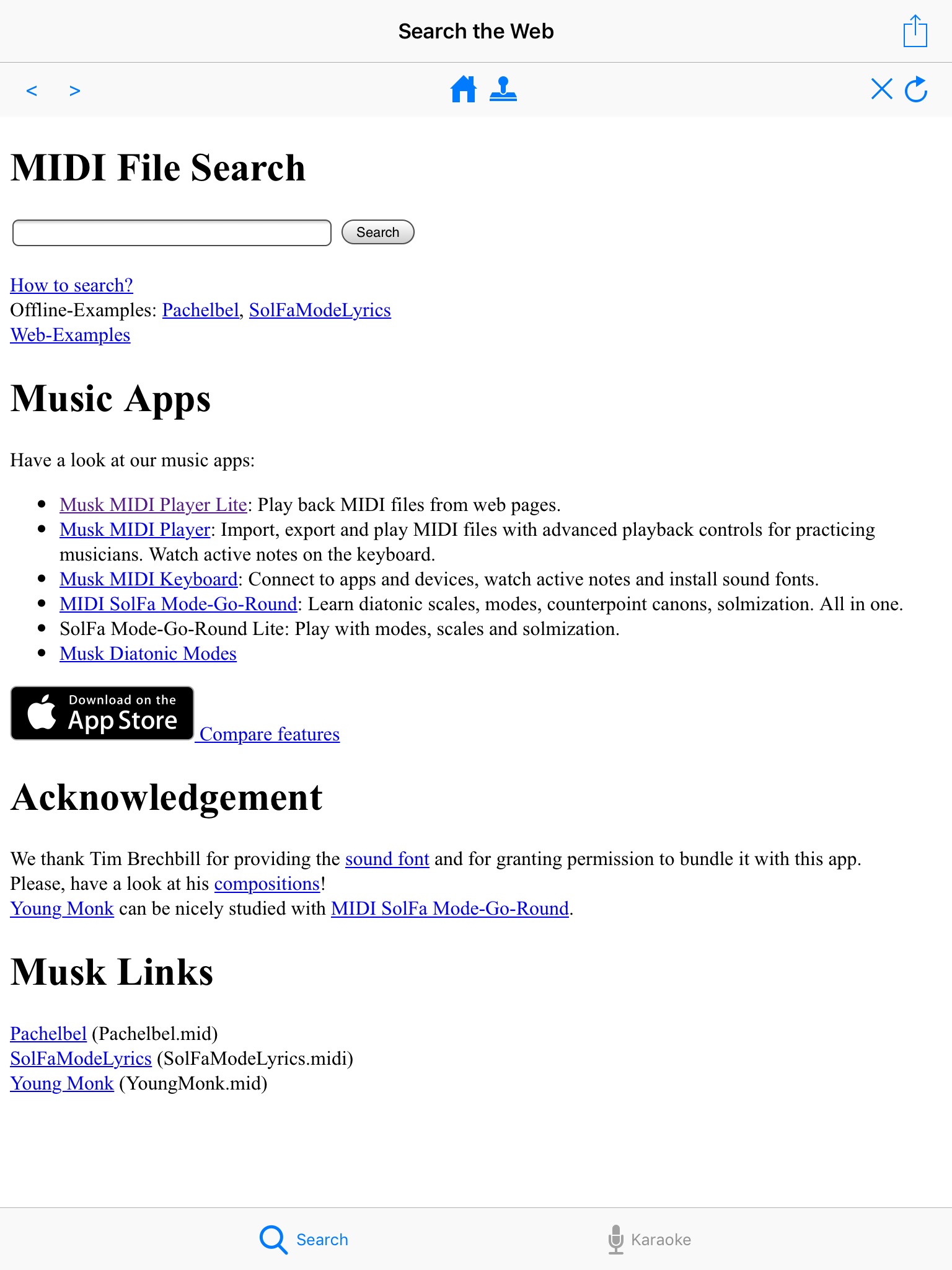 * Use the built-in web browser to search for MIDI files on the web.