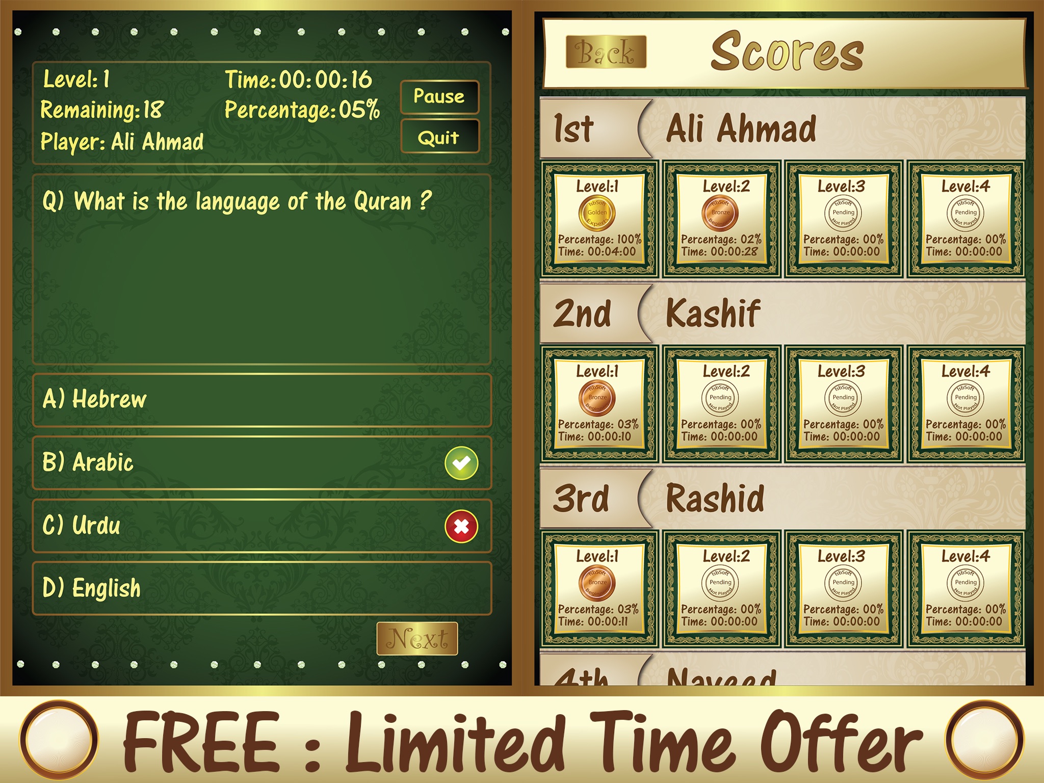 To keep it more interesting we also including a score board in the app. It will contain all the information of each user (Children) playing the app which help parents/Guardian to keep a track of their child learning. On the other hand it encourages the children to score more then the other users to get at the top position which ultimately lead to their more interest in ISLAM and they gain more knowledge.