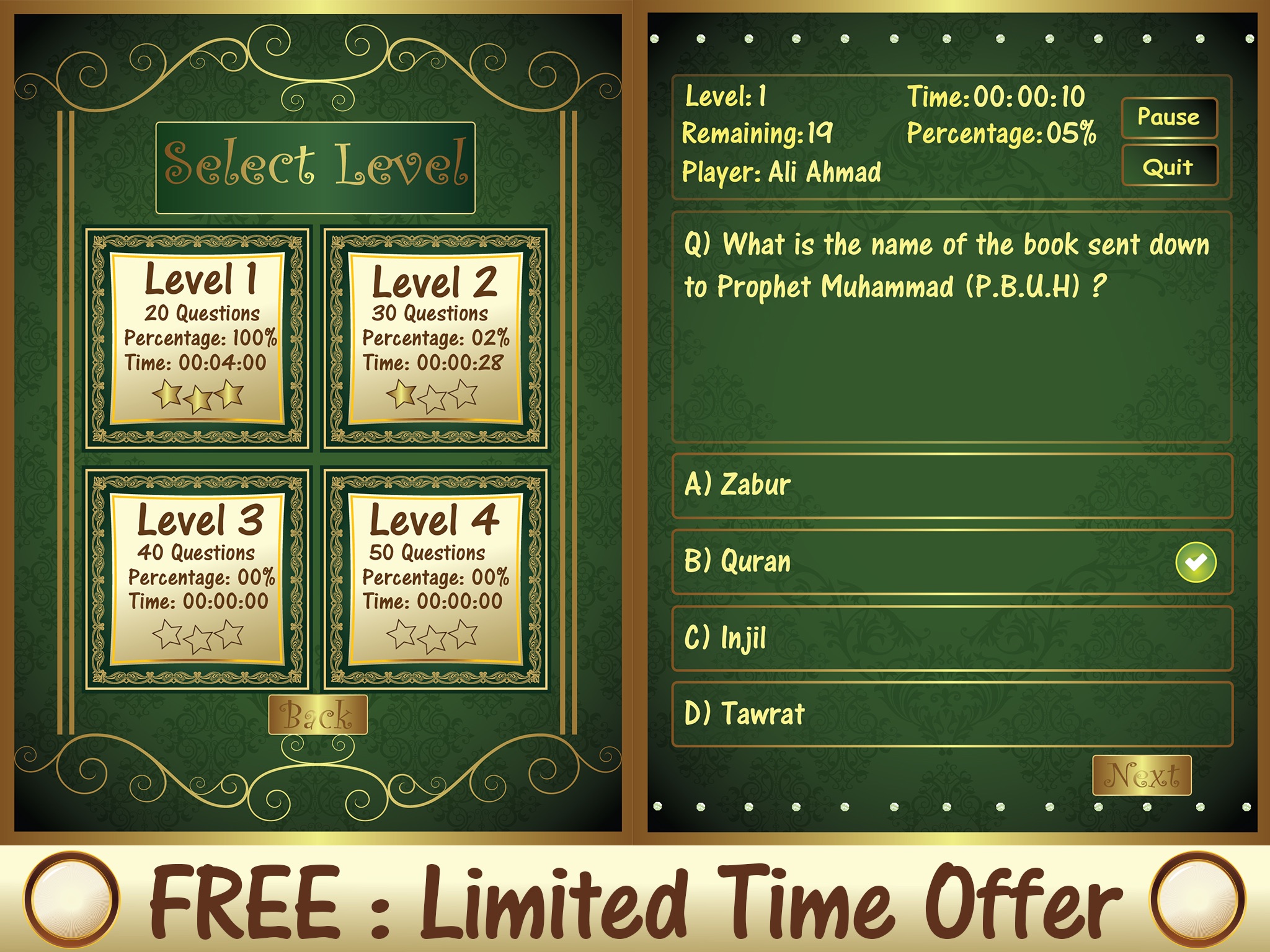 After playing any level your children can see his/her Level completion time, level percentage and his/her star rating all these things attract your children attention which lead them to keep engaged in the app and learn more about QURAN and Islam.