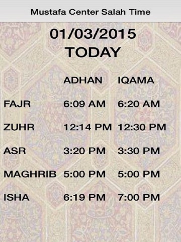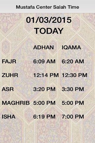 This is a basic app that displays salah/prayer time at Mustafa Center, Annandale, VA.