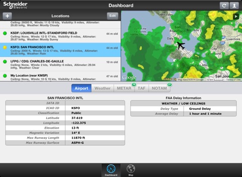 • A full-featured airport and location weather briefing package that provides current METARs and TAFs, colorized and decoded for your location or nearest reporting station — and all METARs from a 50 nautical mile radius for fast review conditions, as well as detailed airport information with sunrise and sunset times