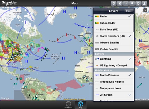 • A location-based dashboard featuring your custom locations for fast access — includes mini maps showing at-a-glance, location-specific weather with animated radar and lightning strikes