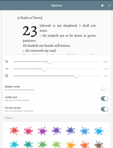 My ASV Bible comes with powerful options for tuning typography to your personal needs and preferences. Choose from our hand-picked selection of 18 fonts. Adjust side margins, font contrast, verse formatting and more. All with live-preview so you know what youre doing!