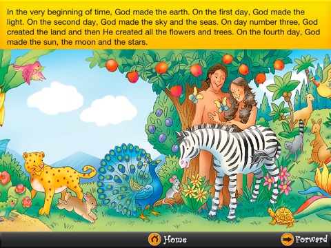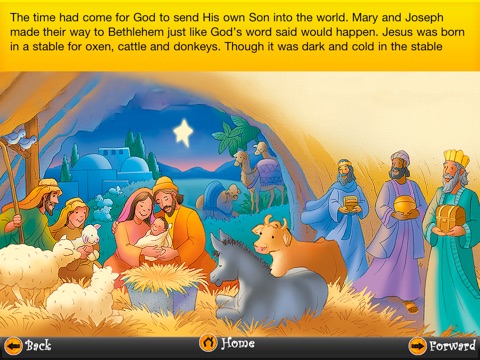 The stories stay true to the Biblical account but are told in words that young children can easily understand. The stories told cover Some well known stories from the Old Testiment and the stories from the New Testiment cover the sequence of the high points of the life of Christ. I am really impressed with the way the stories are told concisely and in a child language. I would recommend this app! The only thing I would suggest is to possible place some interactive buttons within the pictures so that a child could touch and make an animal move or make a sound happen that relates to the story in some way. Great job!