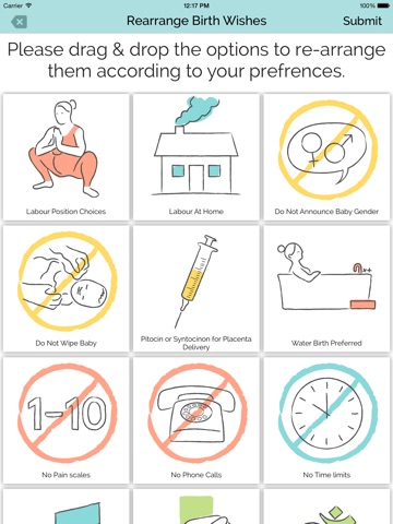 The best way to ensure your birth wishes play out as close to perfect as possible is to communicate them clearly with your care providers - ahead of time. Rather than write a lengthy plan that may not be read in its entirety, or could be misconstrued, why not use our simple visual tool that communicates your message quickly and succinctly.