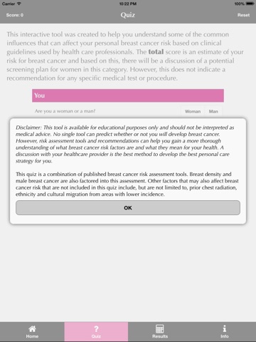 My Breast Friend is here to help you understand your risk for developing breast cancer by incorporating well-known risk factors and making it your own personal tool. It includes the newly popularized breast density as well as discusses breast implants and male breast cancer. Once your risk has been calculated it gives possible recommendations that may be made by your health care provider enabling you to ask questions before your appointment.