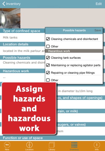 You can take pictures and record information for each space. As an additional awareness aid, possible hazards are listed for commonly found confined spaces. You may also want to use our companion website that offers the same features as the app on your handheld device.