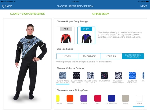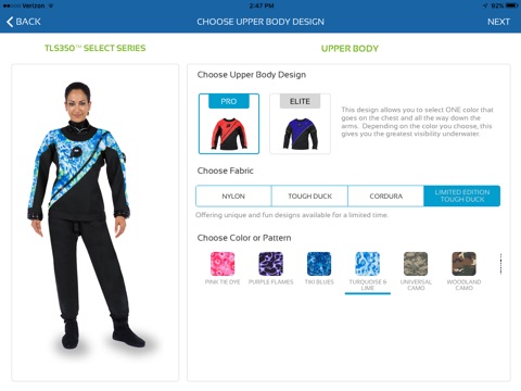 My Drysuit app is fun and easy. See your custom drysuit change as you choose your style, design and color. You will also get to choose your boots, seals, pockets, pads and other accessories. And we’ve got lots of product details, too!