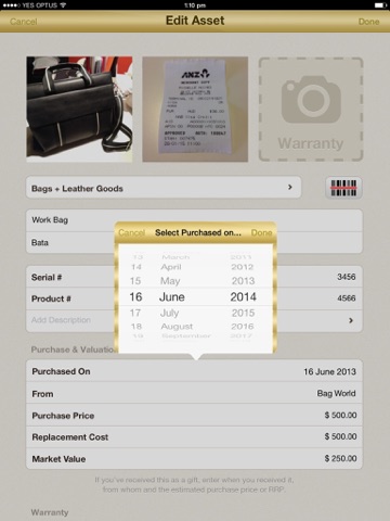 * Quickly and easily create an inventory record of key valuables/home content purchases including receipts/photos/warranties