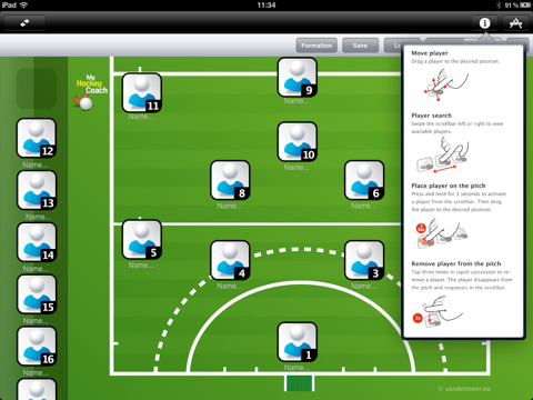 In this version of My Field Hockey Coach you can prepare your team arrangement. It is also possible to save this arrangement. Give the player a name, place them to the correct position and determine the tactics.