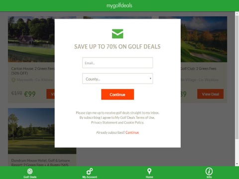 My Golf Deals delivers 50-70% off green fees in top golf courses across Ireland. As well as huge discounts on lessons, gear and everything golf.