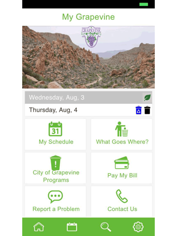 The My Grapevine app allows our citizens and guests the ability to help us make Grapevine a better place to live, work and visit. Have an issue that needs to be addressed by City staff? Use My Grapevine to report the issue using the GPS enabled report a problem tool. The My Grapevine app assists with locating a recycle drop-off center, offers a City events calendar and acts as a personal assistant when additional City of Grapevine information is needed. Keep Grapevine at your fingertips with the My Grapevine app.