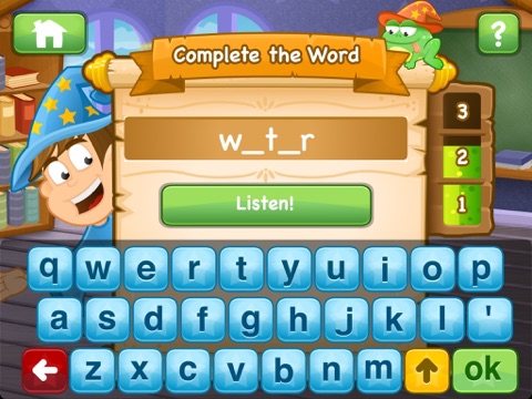The app says the word, then uses it in a sentence, then repeats the word. You spell the word with the keyboard and progress to the next word.