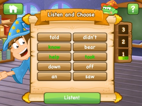 (1) Listen & Choose. The app says a word and you need to select it from a list of 10;