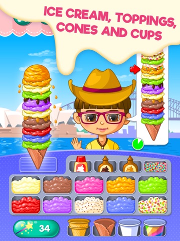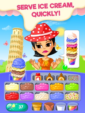 The whole world loves ice cream. Start this frozen and sweet adventure in Europe and continue travelling by truck to North America, South America, Africa, Asia, Australia and Antarctica. Prepare the most delicious ice cream towers as fast as possible within the time limit. Multi scoop ice cream can be composed of many different flavors, toppings, cones and cups. When you earn coins by serving your customers these refreshing treats, you will be able to expand your ice cream business.