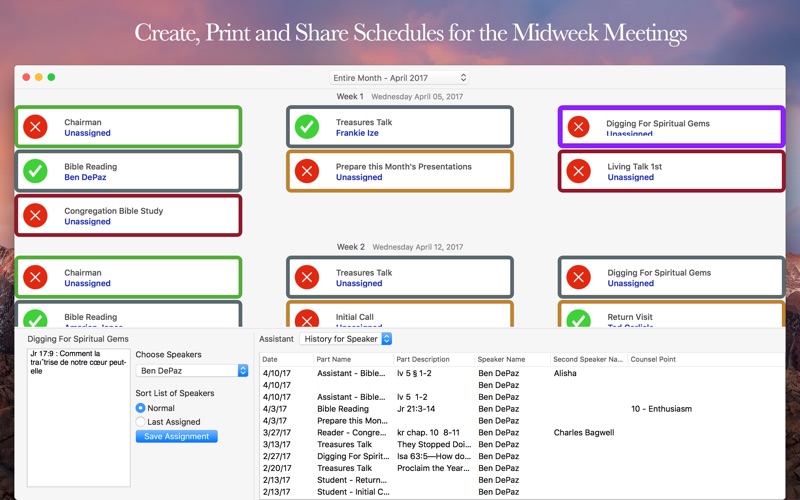 My Life and Ministry is a tool to help with the Midweek Meeting of Jehovahs Witnesses. This app has full scheduling capabilities for the meeting and timers to keep track of the meeting and individual part times. In addition to timing and scheduling, there is a "Stage Mode" that lets you use the app as a stage timer.