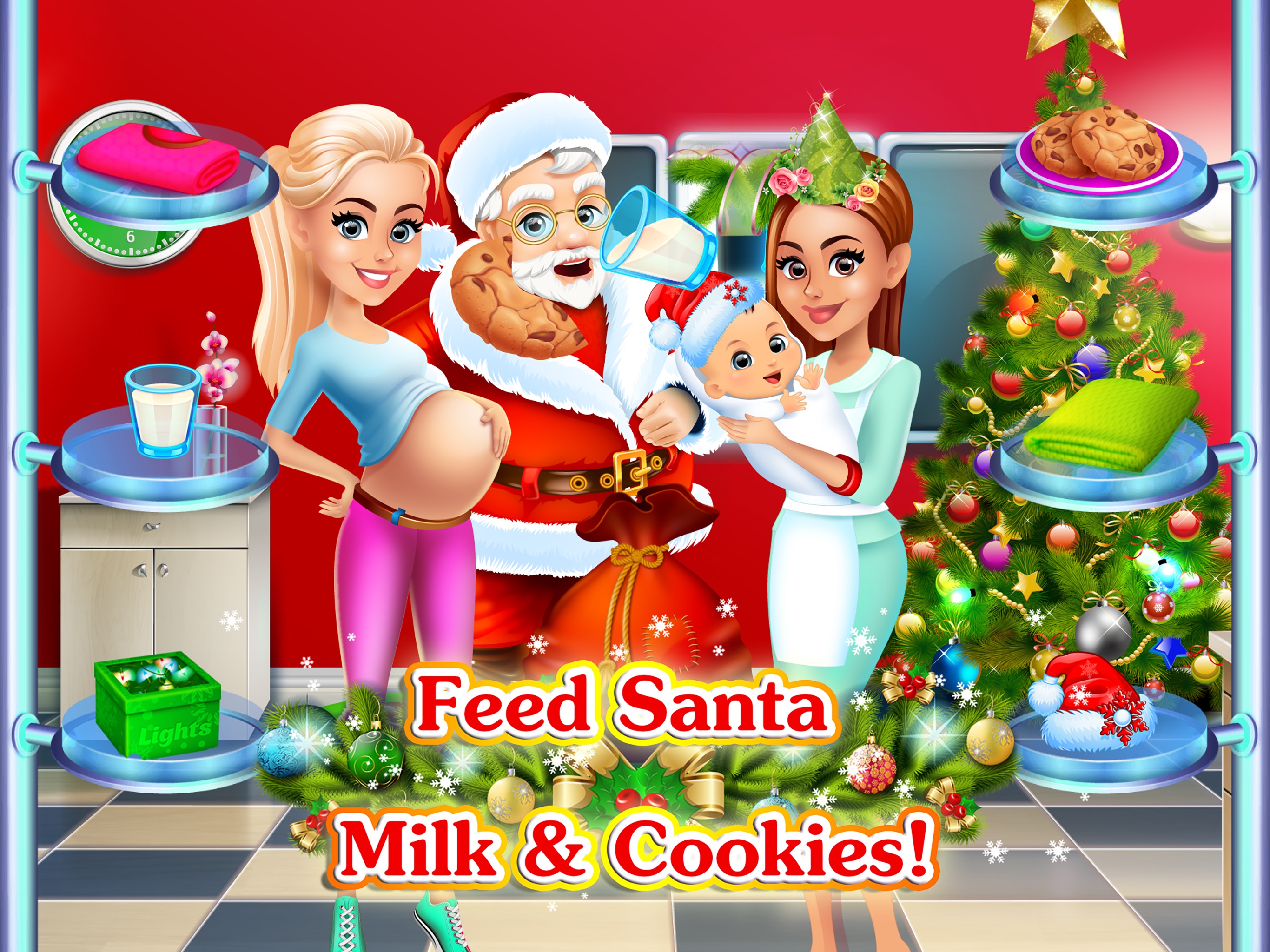 Level 1: Santa care with mommy. elf and baby! Feed Santa milk and cookies!