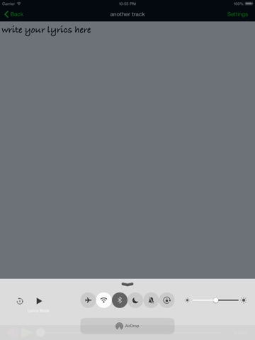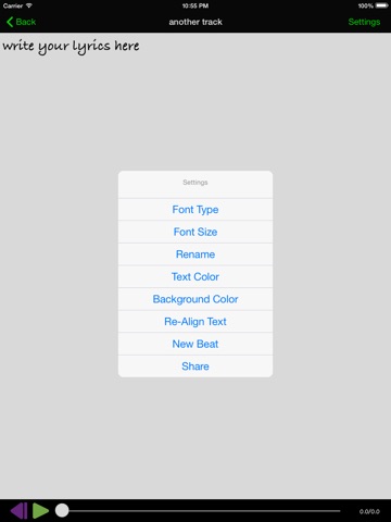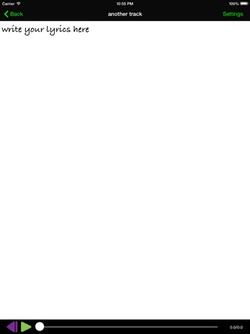 This app allows you to take a song from your library and write lyrics with the track, all in the same app. The lyrics are saved to core data with the song id so every time you put the song on in the app, the lyrics you wrote come on screen. You can start now and finish later! There is no need to open you iPod player and notepad anymore, its all in one. More skins coming soon, some free and some for a fee! Enjoy
