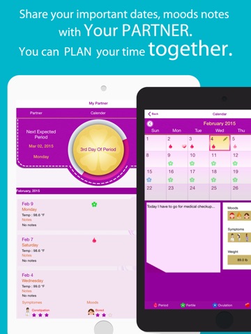 MyPeriodTracker is a very accurate ovulation Predictor / Calculator. With high level of Privacy Protection, you can now share your emotional and physical health state with your Partner (**CROSS PLATFORM ENABLED**). It comes with feature like shared Healthline, Period Events calendar, Lifestyle Calendar, help to find possible prospective days for conceiving a baby or even AVOID unwanted pregnancy etc.