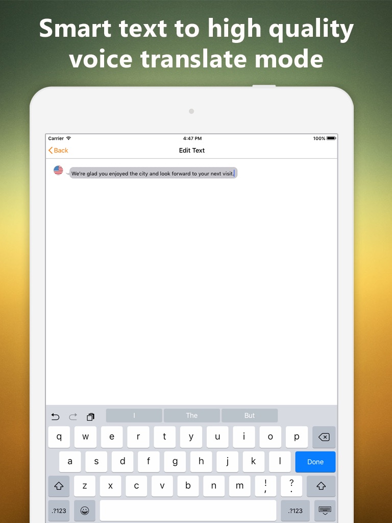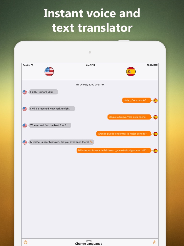 Now you can instantly translate to and from 38+ different languages whenever you want. Simply select the source language and the language into which you want to translate, tap of the flag wait for the signal and start speaking. In the box below the text, the translation will be displayed and automatically speak as per the voice available. You can edit translation text by tapping on edit button. You can copy translation text to any other application, email, SMS, Whatsapp, Facebook or Twitter.