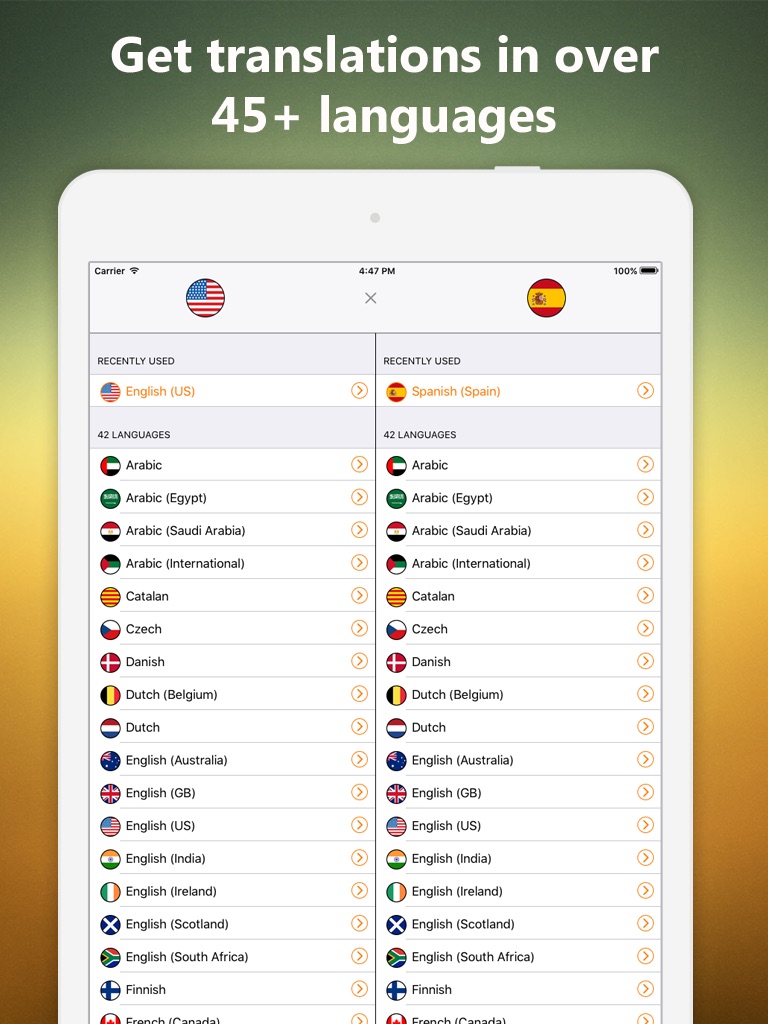 • Translate words, phrases, and text between 38+ languages