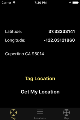 From anywhere you press the "Get My Location" button to obtain the GPS coordinates and the corresponding street address. You can save this location information along with a description and a photo in your list of favorites.