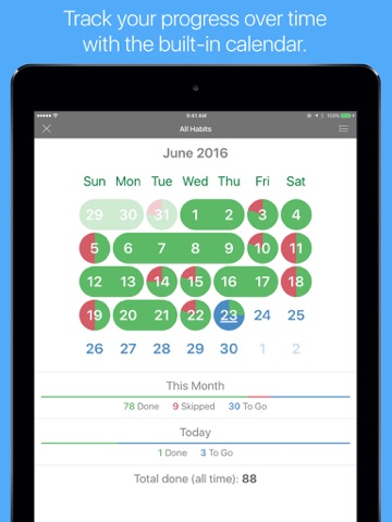 • The calendar view lets you monitor your progress over time.