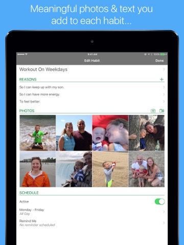 • Each habit can have multiple photos and text reasons.