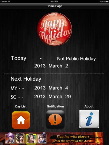 Worry about malaysia or singapore holiday. do not know when is the public holiday. Hope can sleep more during public holiday. Now with this application, you can know when is Malaysia and Singapore public holiday any time. User always can know when is the next holiday for Malaysia or Singapore.