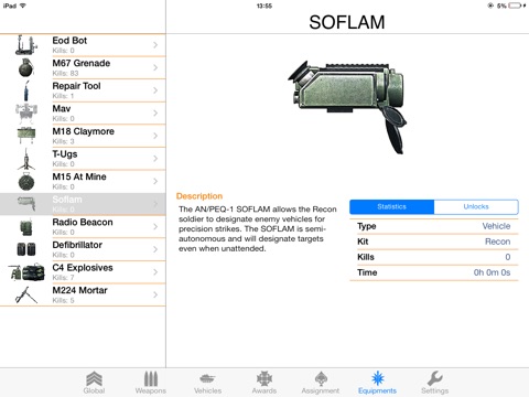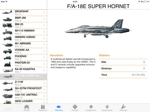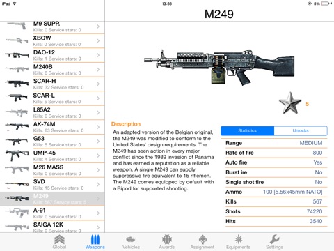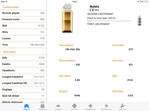 Check your score, review detailed information about weapons, vehicles, assignments, ribbons and medals.