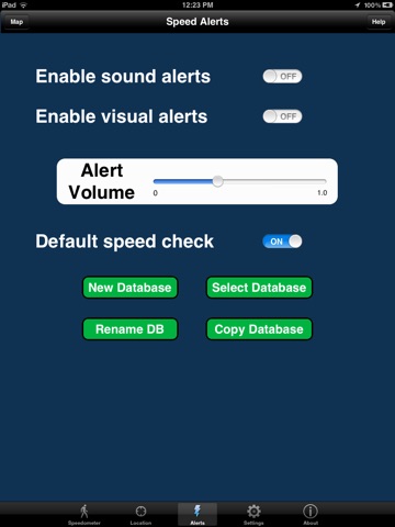The Alerts tab has options for the speed limit feature, to save and restore database files with speed limit data, and to show a map with all speed points displayed.
