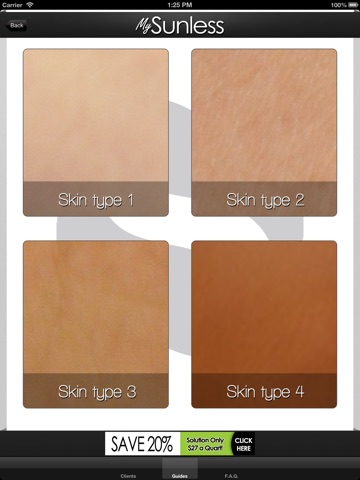 - Skin Chart Selector : Allows you to show your customers what color their skin type (Type 1, 2, 3, and 4) will develop too after sunless tan is developed.