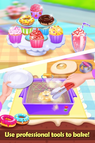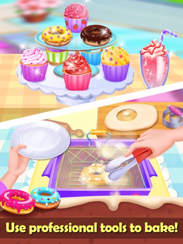 • Run your own sweet bakery shop! Use professional tools to bake cupcakes, fry donuts, make milkshakes and decorate them as you like and serve to your customers!