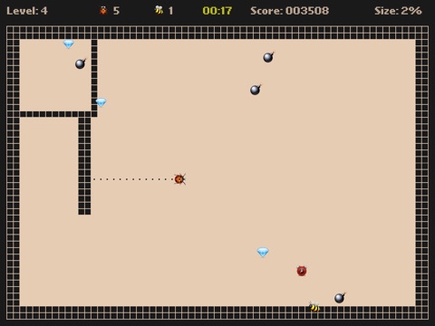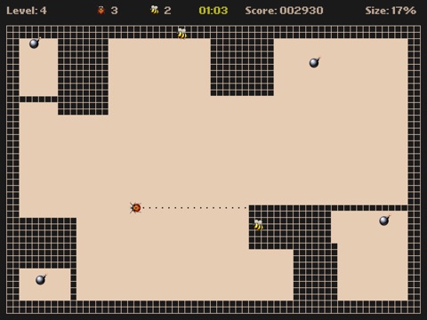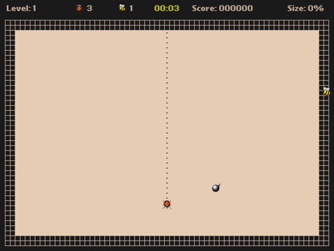 Moving Ladybird on the light parts of the field you capture territory. The captured parts of the territory is painted in a dark color. Moving Ladybird on the light parts of the field you need to be afraid the bombs. If a bomb hit to Ladybird or on its track youll lose a life. Ladybirds movement on its track is forbidden! Moving Ladybird on the dark parts of the field you need to avoid the bees. Every minute, the number of bees increases! When the territory is captured more than 70% of the field youll be moved to the next level.
